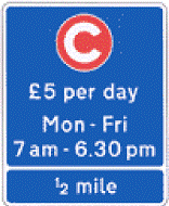 Resim 3–1:         2003’te Londra’da Congestion Charge (Trafik Sıkışıklığı Ücreti) uygulanan bölgeye ait trafik bilgi levhası (ücret, geçerli olan süreler, bölgeye kadar olan mesafe)